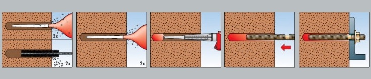 Монтаж химического анкера не вызовет затруднений. Мероприятие проходит в 5 этапов: