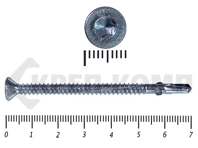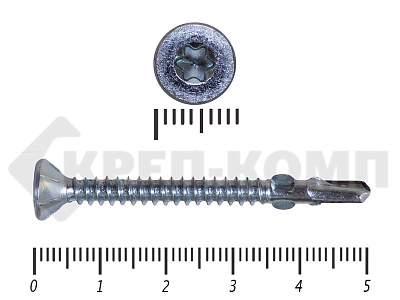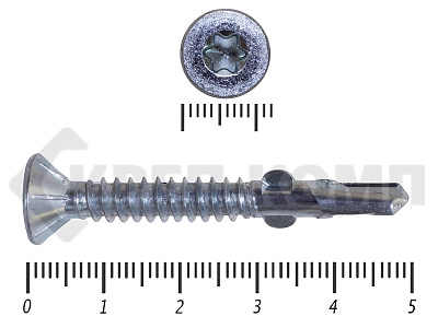 Конструкционные (Флюгельные) саморезы (дерево-металл), применяются для крепления деревянных досок к металлическим конструкциям. На конце самореза, чуть выше сверла, есть ушки, которые при прохождения дерева, рассверливают его, для тог, что бы саморез не касался стенок доски. Это делает закручивание самореза более простым, и надежнее прижимает доску к металлическому основанию. Кода сверло самореза достигает металла, ушки обламываются, и далее саморез легко вкручивается в металл, прижимая доску.